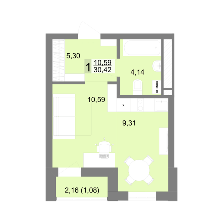 | Общая площадь: | 30.42 м2 |