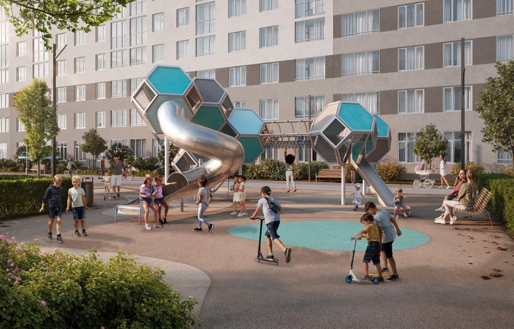 Живые зелёные изгороди защитят жителей первых этажей от посторонних взглядов. Уютный сад с плитняковыми тропинками, перголами и столиками подойдёт для семейных вечеров и встреч с друзьями. Вдоль дорожек установят невысокие фонари. По периметру двора появится велодорожка. Игровые площадки покроют травмобезопасной резиновой крошкой. Малые архитектурные формы: