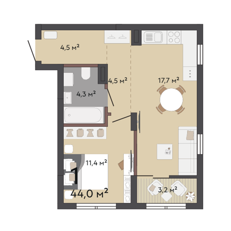 | Общая площадь: | 44 м2 |