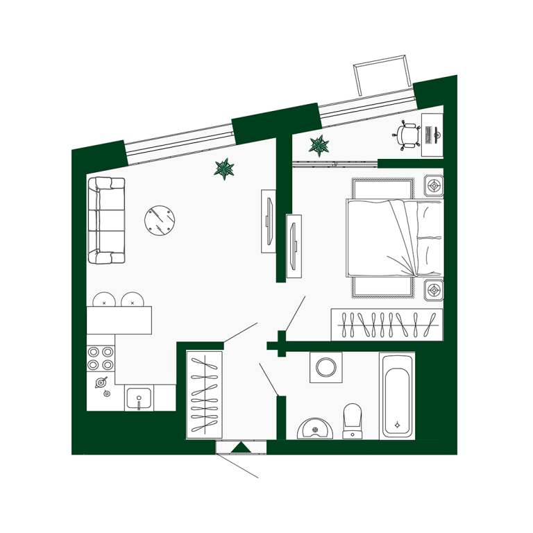 | Тип квартиры: | 1-комнатные |