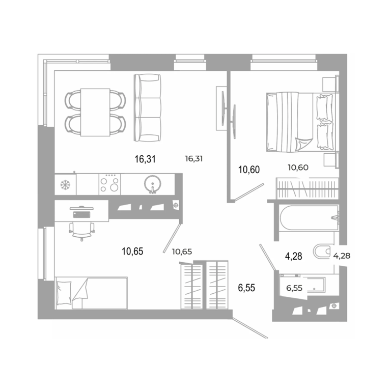 В проекте 25 планировочных решений: от уютных студий от 21,51 м² до квартир с тремя спальнями и кухней-гостиной до 66,58 м² с функциональным разделением на гостевую и приватные зоны.