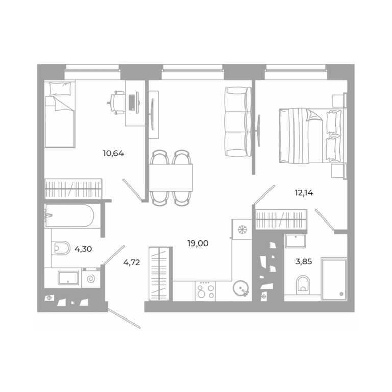 В проекте 25 планировочных решений: от уютных студий от 21,51 м² до квартир с тремя спальнями и кухней-гостиной до 66,58 м² с функциональным разделением на гостевую и приватные зоны.