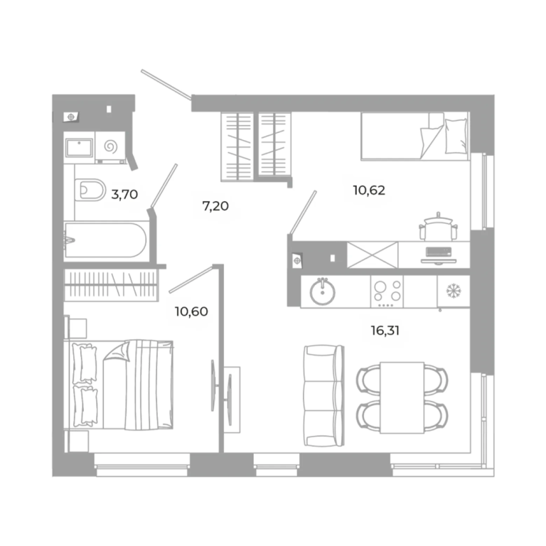 В проекте 25 планировочных решений: от уютных студий от 21,51 м² до квартир с тремя спальнями и кухней-гостиной до 66,58 м² с функциональным разделением на гостевую и приватные зоны.