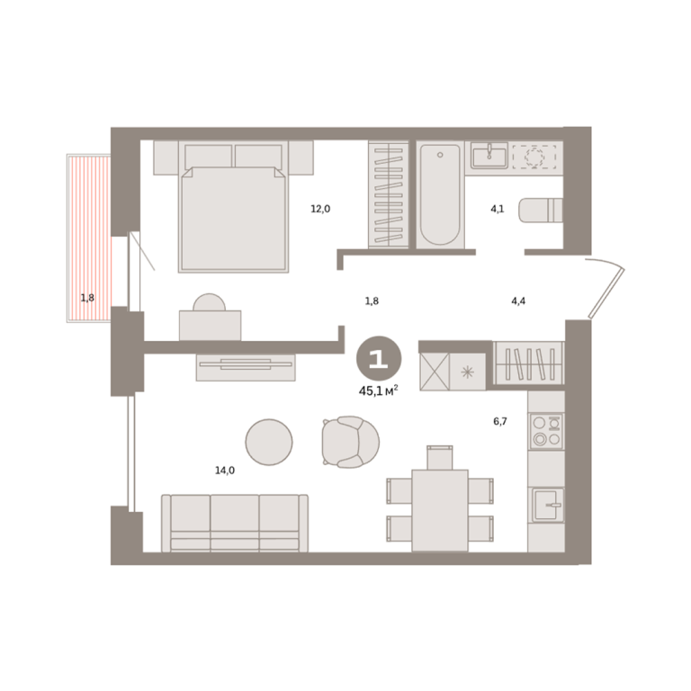 | Общая площадь: | 45.1 м2 |